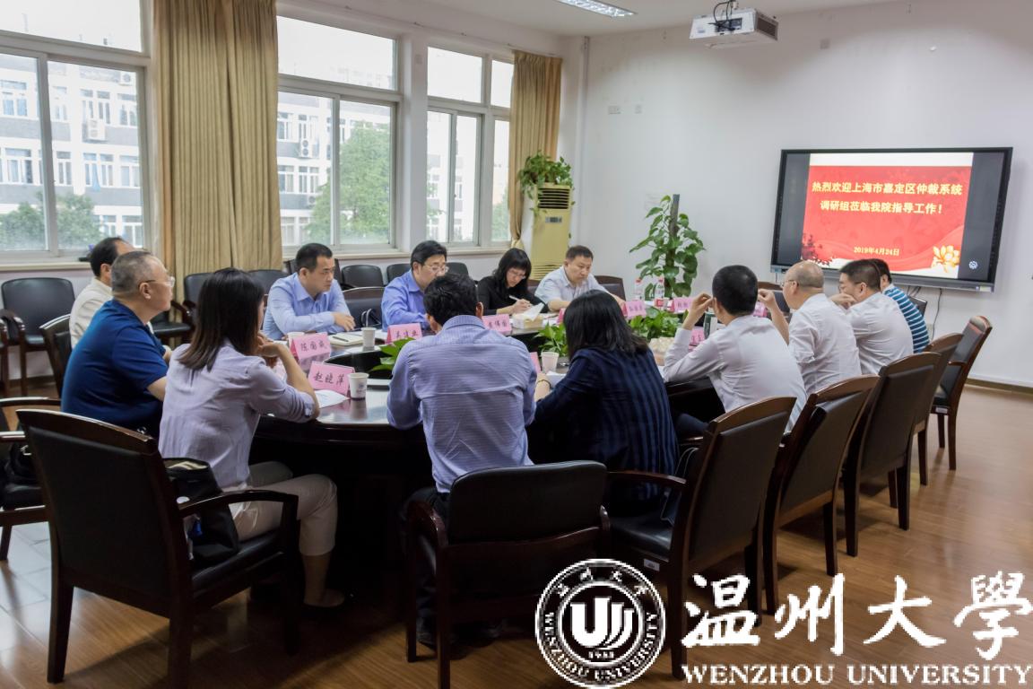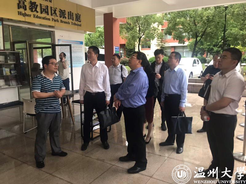 由上海市嘉定区人社局副局长戴伟国带队区劳动人事争议仲裁院、区劳动监察大队、调解仲裁管理科、劳动保障监察管理科、劳动关系科等部门组成的调研组一行8人冒着大雨参观了高教园区派出庭和职工服务中心高教园区分中心。市人社局副局长李道钮、市仲裁院副院长柳景珏以及瓯海区人社局党组成员、社保中心主任周肖瑜、区仲裁院院长陈光海陪同考察。