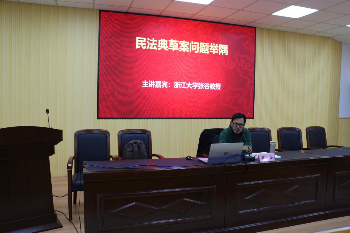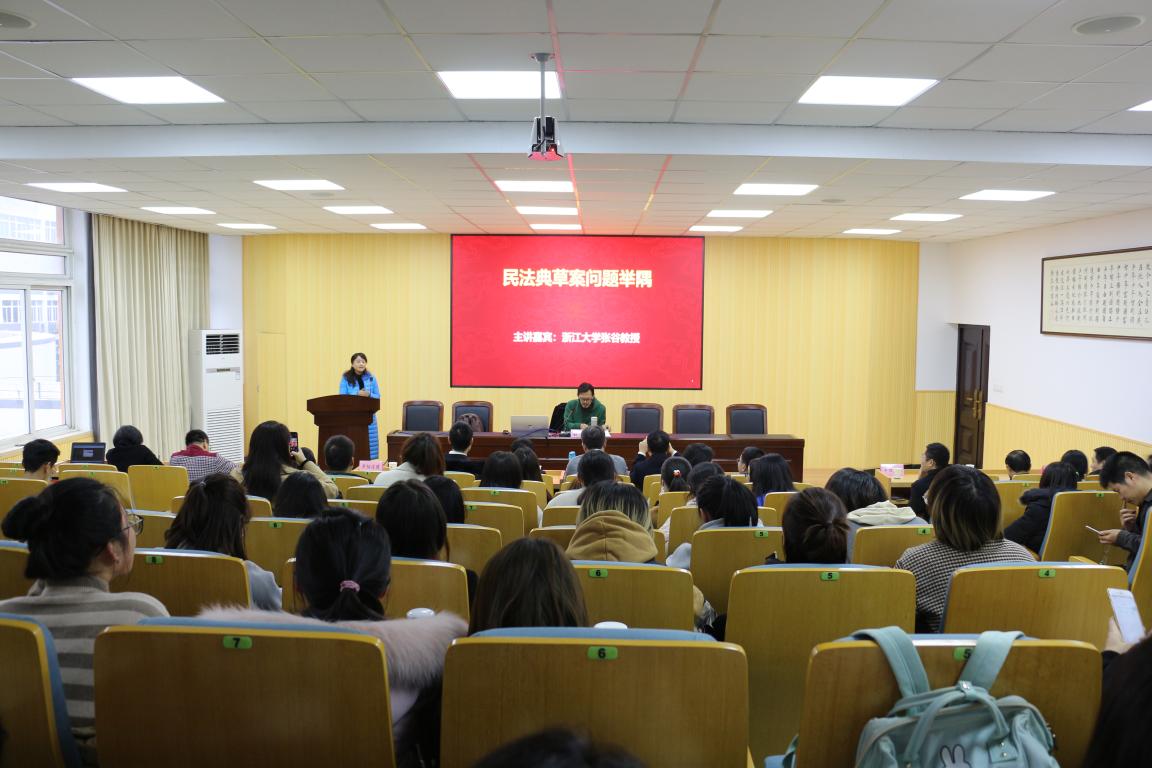 2018年12月14日下午,温州法治大讲坛专题讲座特邀浙江大学张谷教授主讲《民法典草案问题举隅》,国产自拍 法政国产自拍 法学系主任何平主持,平阳法院、市律协、国产自拍 师生逾百人参加讲座。