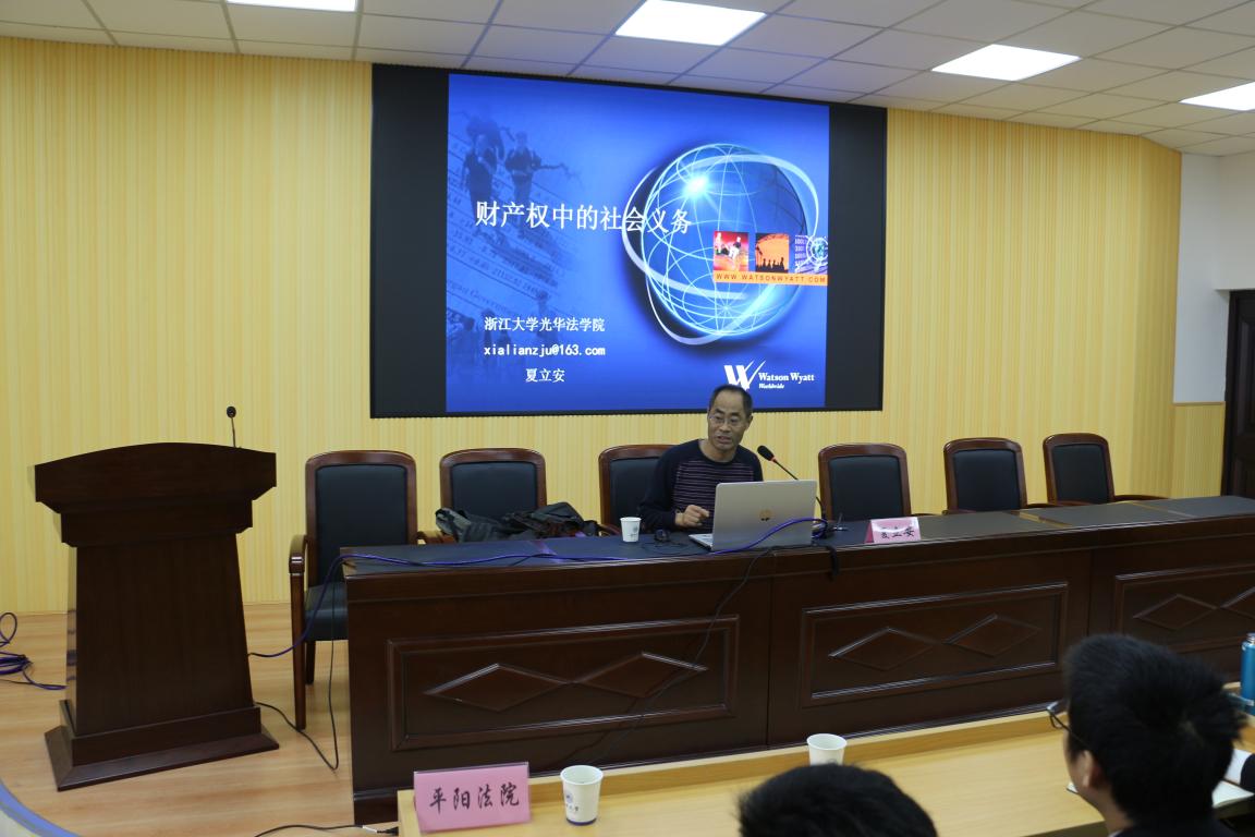 2018年12月14日周五下午1点半,在国产自拍 法政国产自拍 301报告厅,浙江大学光华国产自拍-偷拍自拍视频 夏立安教授以《财产权中的社会义务》为主题展开了一场精彩的讲座。本次讲座由王宗正院长主持,有来自包括温州法律实务界的法官、律师、检察官,以及国产自拍 研究生、本科生等,济济一堂,共享夏立安教授所带来的这场国产自拍 盛宴。