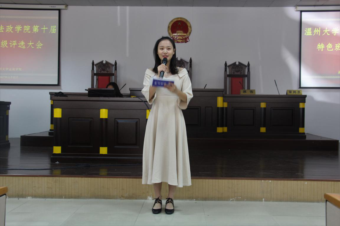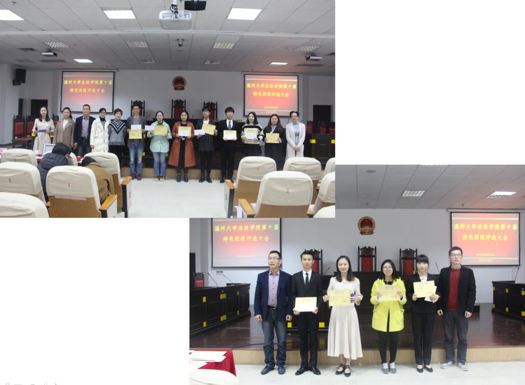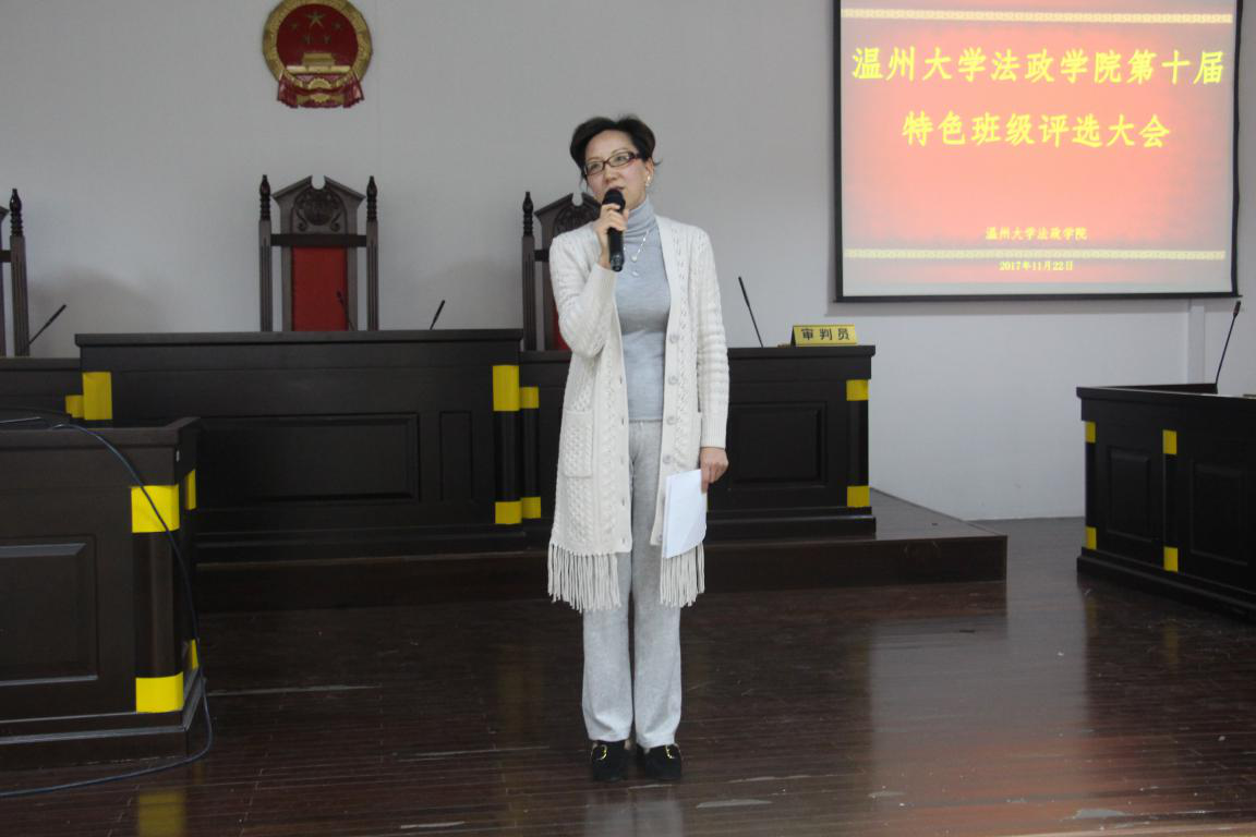 2017年11月22日下午,国产自拍 法政国产自拍 第十届特色班级评选大会在模拟法庭举行。担任本次评选大会的评委有法政国产自拍 党总支副书记严玲红老师、校国产自拍 处国产自拍 管理科科长吕乐老师、法政国产自拍 教学科科长夏小娜老师、法政国产自拍 国产自拍 科科长孙德升老师和法政国产自拍 研究生会主席孟晶晶同学。