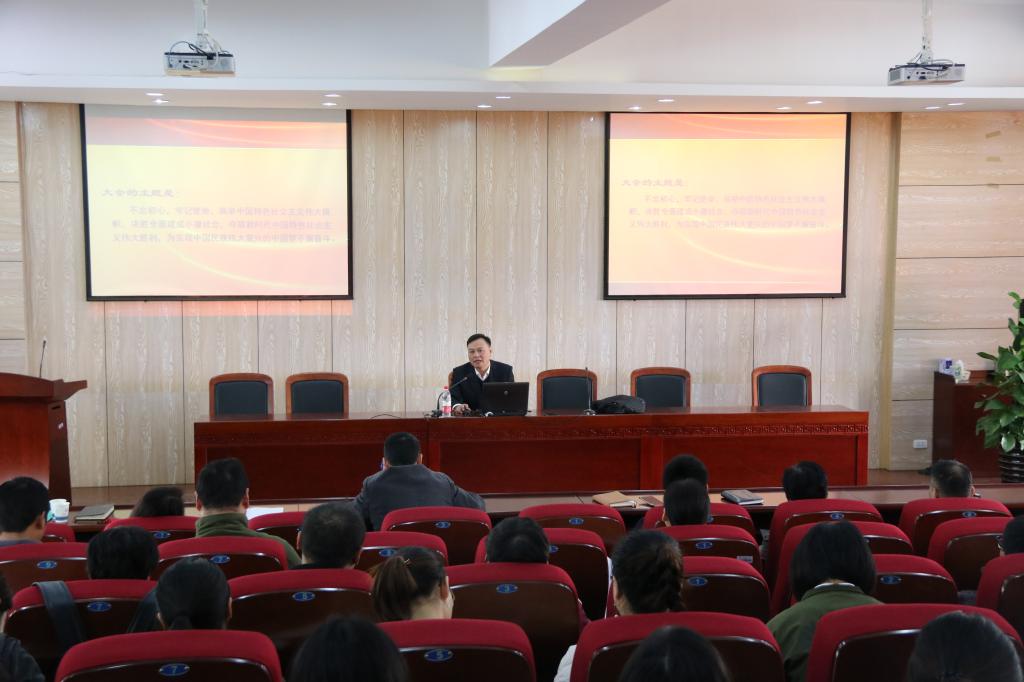 2017年11月22日下午,在人文国产自拍 报告厅举行了法政国产自拍 与体育国产自拍 全体教工和研究生学习会,邀请我校党委委员,宣传部部长潘玉驹作学习十九大报告精神的辅导讲座。