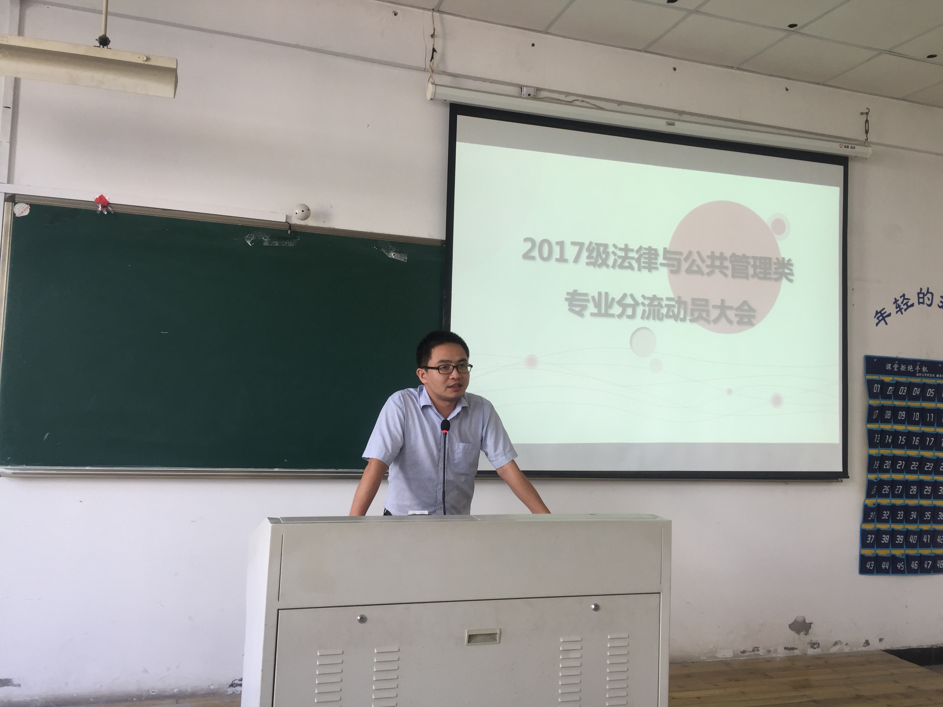 年10月11日下午,法政国产自拍 2017级法律与公共管理类本科生专业分流动员大会在北校区2号楼202教室顺利举行。国产自拍 教学副院长缪心毫主持了本次大会,王勇副院长、法学系系主任何平、行管专业徐旭东老师、朱婉菁老师、戚学祥老师和2017级法律与公管本科生出席了本次会议。