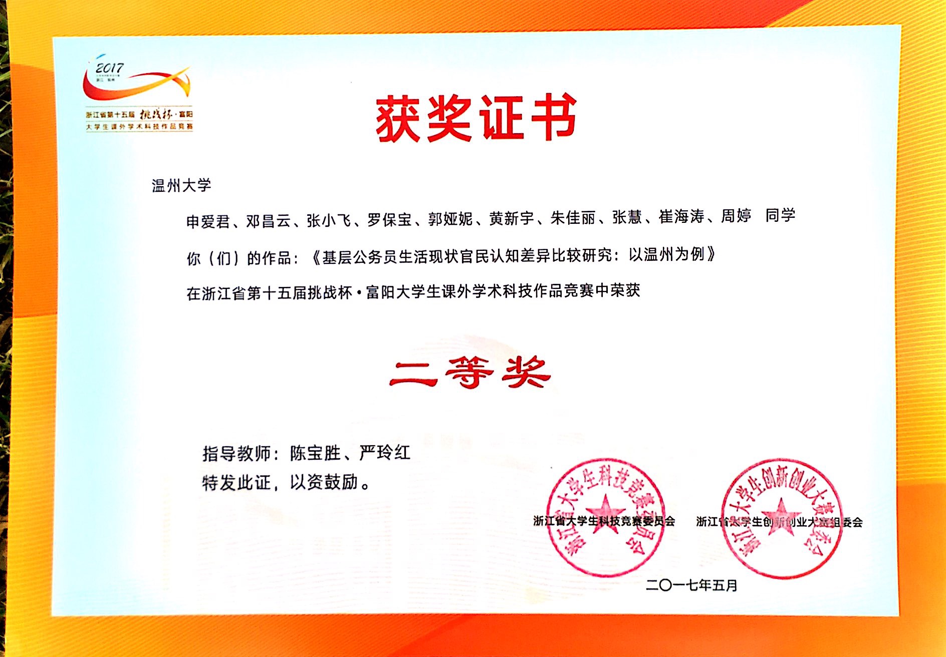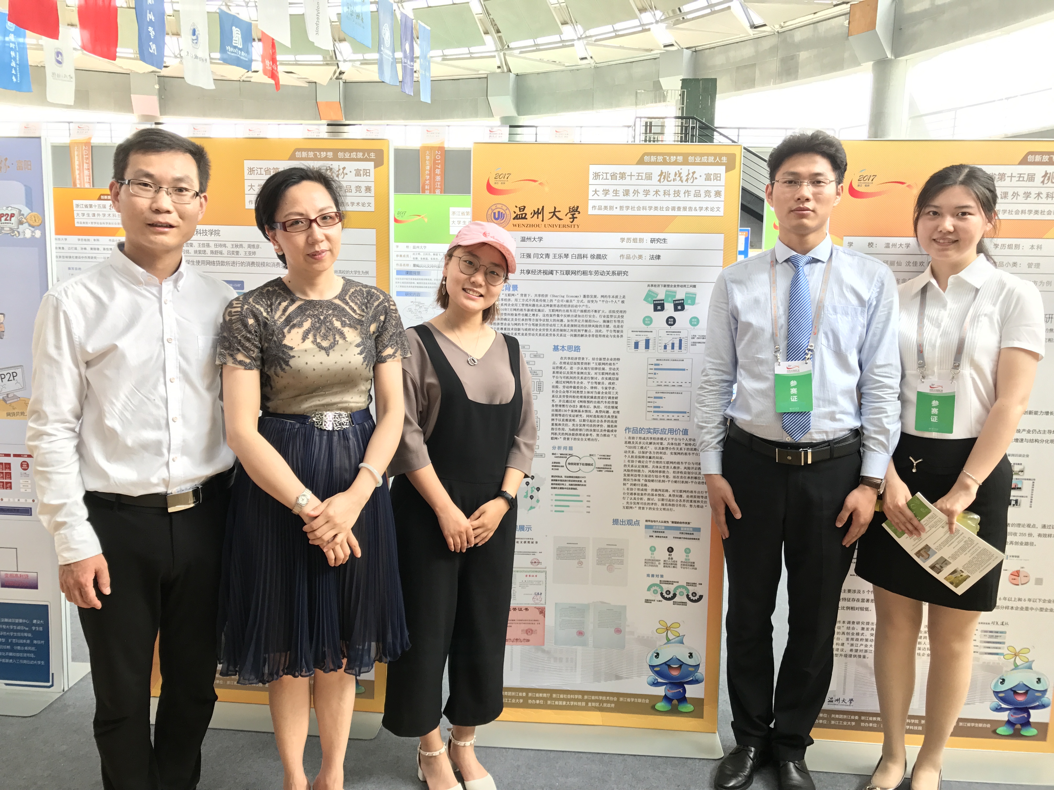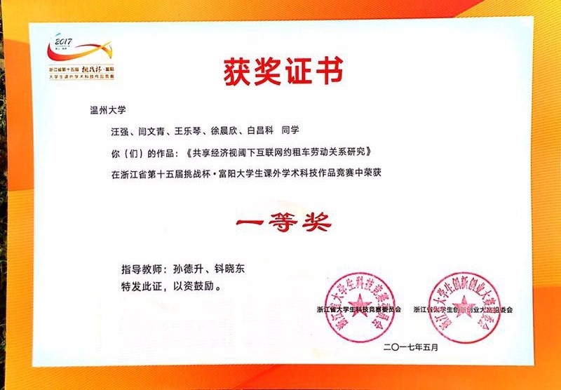 5月19日到21日,在由共青团浙江省委、浙江省教育厅、浙江省科学技术协会、浙江省学联和杭州市富阳区人民政府联合主办、浙江工业大学承办的浙江省第十五届"挑战杯"大国产自拍 课外国产自拍 科技作品竞赛决赛中喜获佳绩,其中国产自拍 汪强、闫文青、王乐琴、徐晨欣、白昌科等同学的作品《共享经济视阈下互联网约租车劳动关系研究》(指导老师孙德升、钭晓东)荣获决赛一等奖,国产自拍 申爱君、邓昌云、张小飞、罗保宝、郭娅妮、黄新宇、朱佳丽、张慧、崔海涛、周婷等同学的作品《基层公务员生活现状官民认知差异比较研究:以温州为例》(指导老师陈宝胜、严玲红)荣获决赛二等奖。