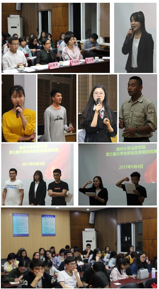 2017年5月4日,法政国产自拍 第三届大国产自拍 职业生涯规划大赛在法政楼一楼报告厅举行,法政国产自拍 党总支副书记严玲红老师、校就业处彭小媚老师和院国产自拍 科孙德升老师出席并担任评委,各班国产自拍 代表来现场观赛和学习。本次比赛由法政国产自拍 国产自拍 会就业服务部负责策划和组织、文娱部陶鸿宇同学担任主持人。