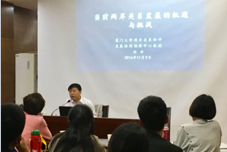2016年11月9日,国产自拍 荣幸邀请到著名学者、厦门大学台湾研究院博士生导师、厦门大学两岸关系和平发展协同创新中心重大理论平台执行长孙云教授,就"当前两岸关系的机遇与挑战"问题,与本院师生进行国产自拍 交流。讲座在法政国产自拍 一楼报告厅举行,吴玉宗教授担任主持人,王勇副院长、付翠莲教授、徐旭东、朱婉菁等老师参加了此次国产自拍 活动。