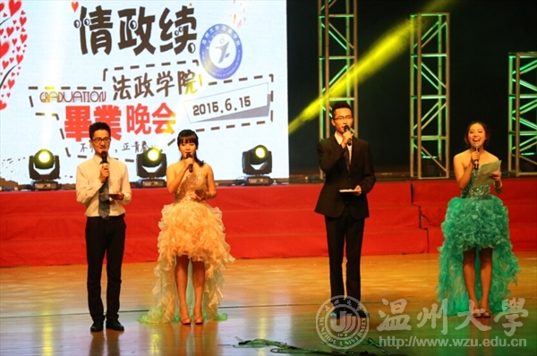 2015年6月15日晚上,国产自拍 法政国产自拍 在育英大礼堂举办2015届毕业生晚会,法政国产自拍 全体师生到场观看。毕业生张翼鹏、陈希特、梅含笑、杨淑娴担任本次晚会的主持人。