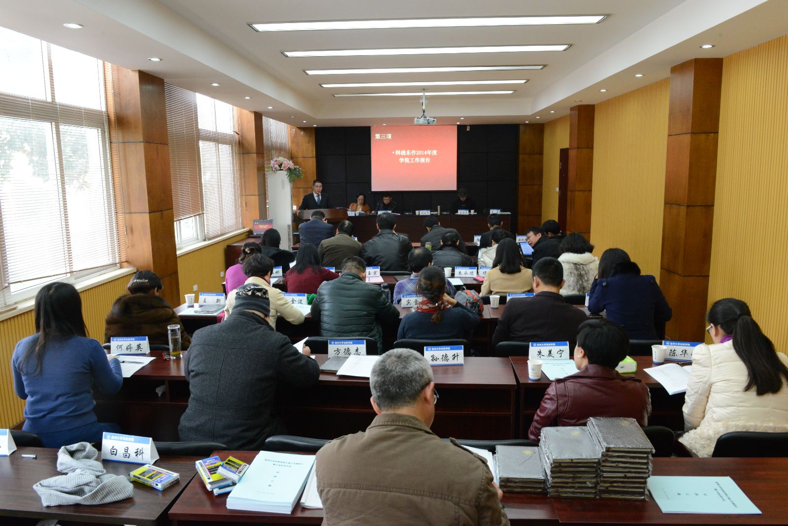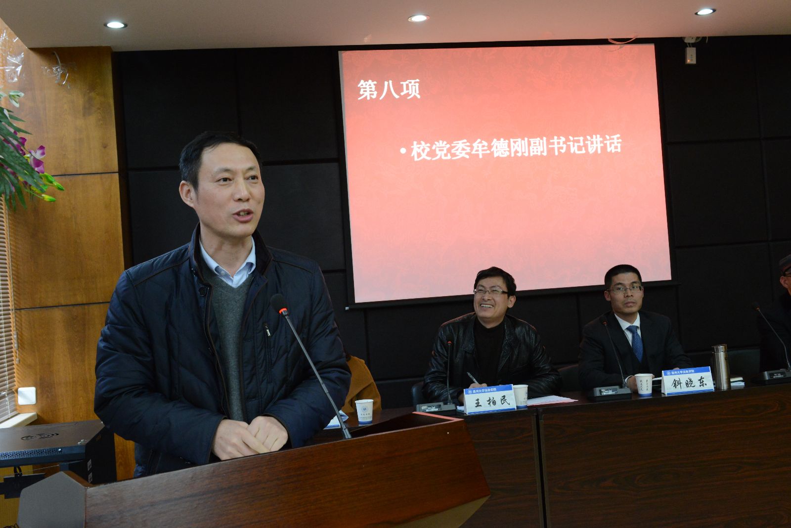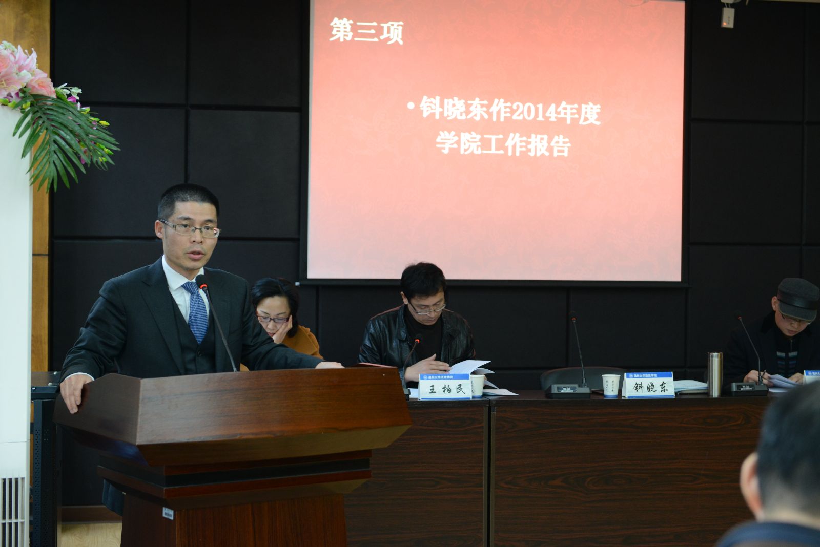 2014年1月17日下午,法政国产自拍 召开了三届三次教职工暨工会会员大会。大会由院党总支书记王柏民主持。学校党委副书记牟德刚全程列席了会议,并在会议结束时作了重要讲话。