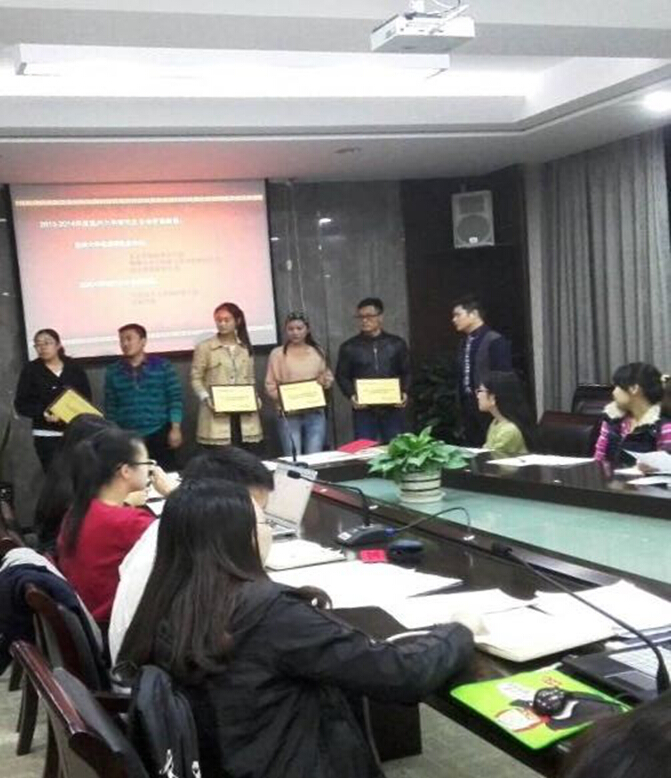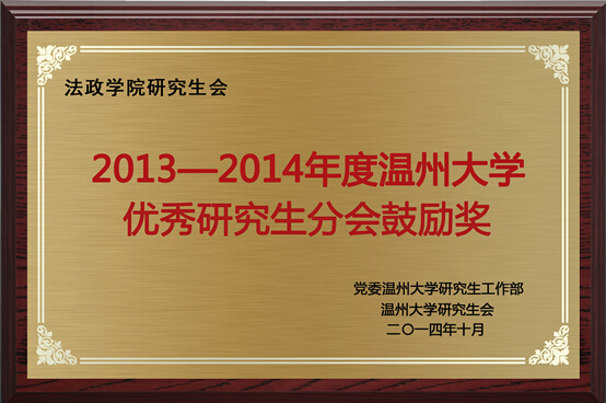 2014年11月27日感恩节之际,国产自拍 研究生会成员李根雪代表法政研会出席了校研究生会组织的国产自拍 第三届优秀研究生分会的颁奖典礼。国产自拍 研究生会荣获2013-2014年度"优秀分研会鼓励奖"光荣称号。