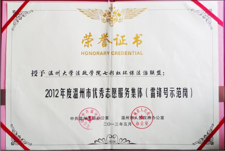 国产自拍 七彩虹环保法治联盟在2012年度开展了内容丰富、形式多样的环保公益活动,为我市"三生融合·幸福温州"的建设做出了 贡献,发挥了大国产自拍 环保社团"实践育人·服务社会"的积极作用,荣获"2012年度温州市优秀志愿服务集体(雷锋号示范岗)" 称号。