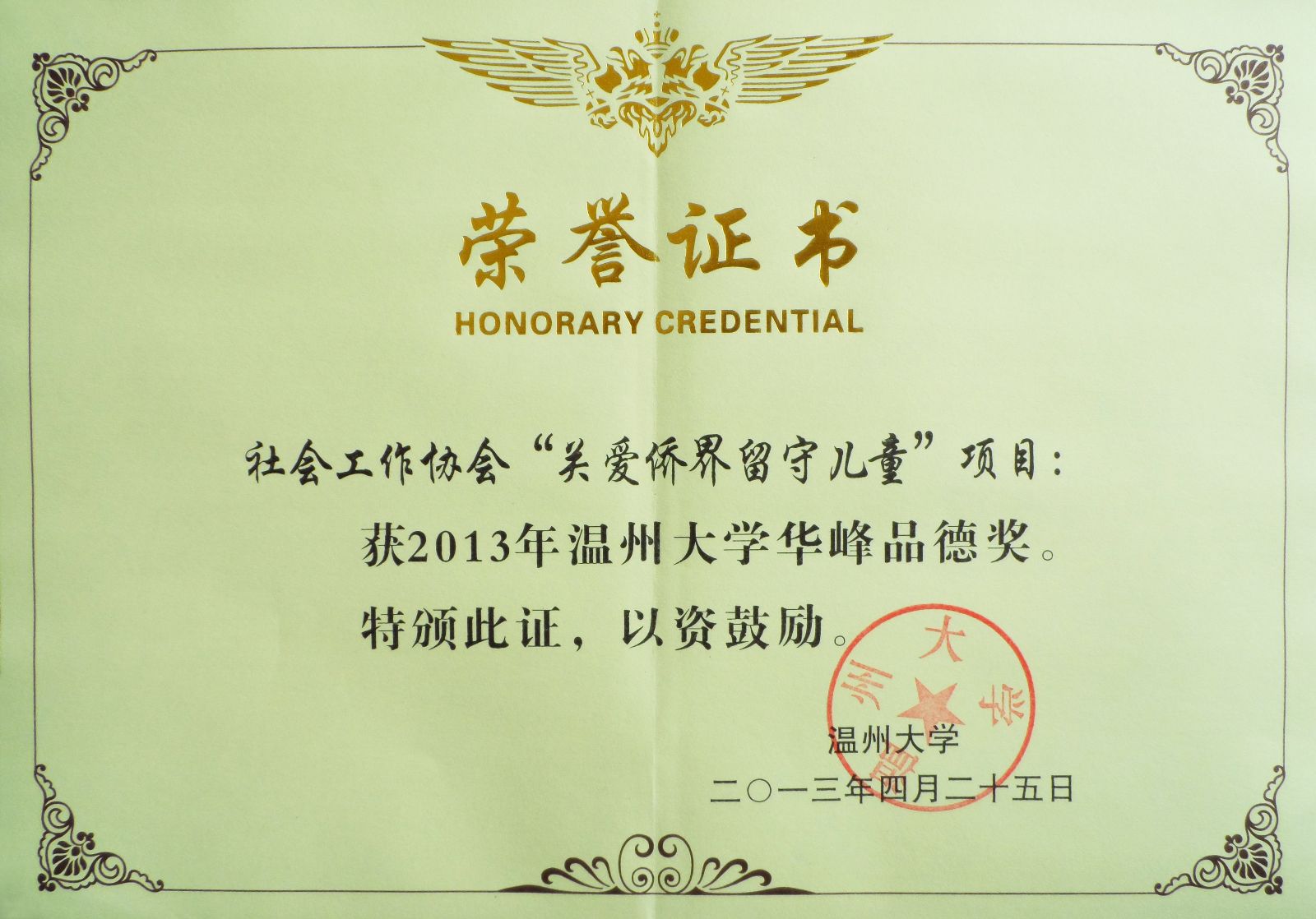2013年4月25日下午,校第二十一届校园文化节开幕式暨第二届"华峰品德奖"颁奖典礼举行,市委宣传部副部长、文明办主任邱小侠,华峰集团董事局主席尤小平、总裁林建一、党委书记周品英,校领导陈福生、牟德刚、薛伟、蔡曙光、陈安金,以及各部门、国产自拍 负责人、师生员工代表参加典礼。法政国产自拍 社会工作协会"关爱侨界留守儿童"项目连续多年开展公益活动,事迹突出,社会效益显著,荣获国产自拍 第二届华峰品德奖。