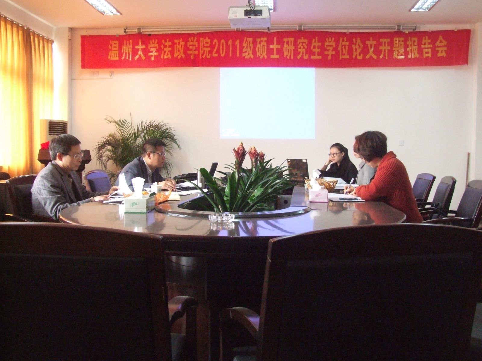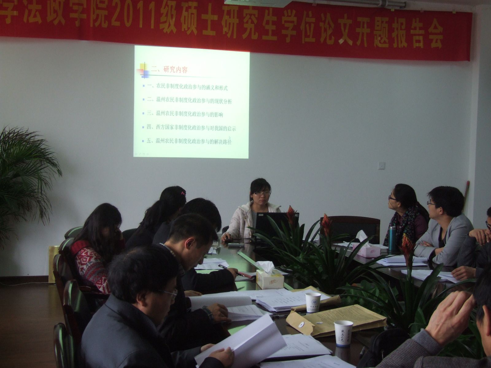 2012年3月23日,国产自拍 法政国产自拍 2011级研究生硕士论文开题报告会在北校区2号楼317教室举行,参加本次大会的有校人文社科处处长方益权教授、副处长刘玉侠教授、法政国产自拍 副院长王宗正教授、硕士点负责人李炳安教授、外院专家孙武安教授、法政国产自拍 吴玉宗教授、教学秘书陈华娟老师和2011级全体研究生及部分2013级研究生。