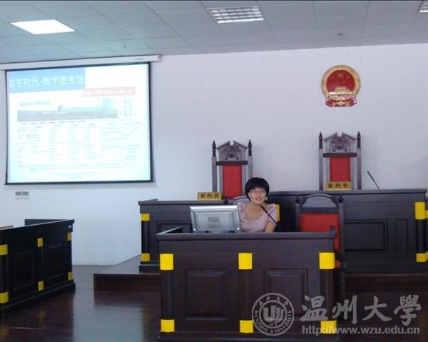 2012年9月19日下午,为了更快更好帮助新生了解和掌握我校图书馆各类资源的使用方法和技能,法政国产自拍 邀请图书馆张小绿老师在模拟法庭为新生开设图书馆资源利用专题讲座。