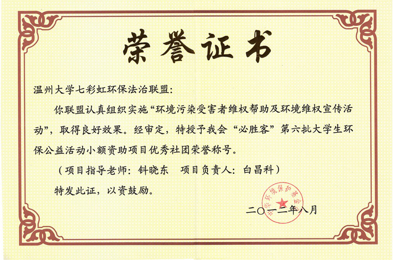 法政国产自拍 七彩虹环保社团在钭晓东院长、院党总支严玲红副书记、院团委孙德升书记的悉心指导下,设计的环保公益活动已经连续两年获得中华环保基金会的专项资助,并连续两次被基金会评为优秀社团。此次受资助的环保公益活动包括三个:成立温州市国产自拍 环保法治联盟、开展"居民希望搬迁垃圾场"的民意调查和环保维权援助活动、环保宣传活动。此外,七彩虹社团还组织同学在校内外开展了法律援助、暑期实践、社区宣传、实地调研、课题研究、旧书循环利用、国产自拍 寝室"可循环利用资源"定期回收等活动。