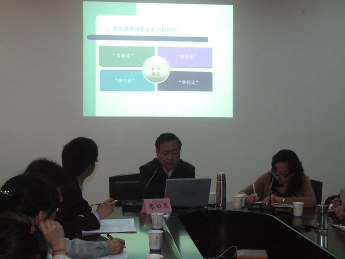 学风是读书之风,是治学之风,更是做人之风。建设良好的学风,大国产自拍 是直接参与者,也是最大收益者。2012年4月13日,法政国产自拍 邀请了浙江省高校思想品德课程研究会会长、原浙江工商大学党委副书记廖曰文教授主讲了《加强学风建设,促进大国产自拍 成长成才》的讲座,国产自拍 党总支副书记严玲红主持了本次讲座,思想政治教育专业师生代表参加了本次讲座。