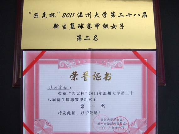 2011年11月16日15:30,在国产自拍 北校室内篮球馆举行了一年一届的"新生杯"女子篮球决赛。此次比赛是法政国产自拍 对战瓯江国产自拍 。历时一个多月的"匹克杯"2011年国产自拍 第二十八届新生篮球赛终于圆满落幕。在女子组各场次比赛中,来自法政国产自拍 2011级法本二班的四名女生廖荻、杨倩文、韦月利、黄小杏在国产自拍 教练朱斌的指导下凭借坚强的毅力和不懈的努力,一展法政学子勇者风范,最终夺得本次大赛的亚军,取得了骄人的战绩!
