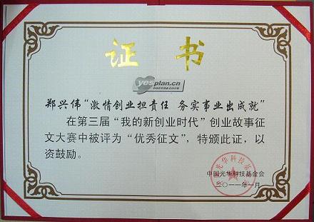 2011年3月31日,全国第三届"我的新创业时代"创业故事征文大赛结果揭晓。法政国产自拍 郑兴伟同学撰写的《激情创业担责任 务实事业出成就》获得此次征文大赛三等奖,浙江省仅有两名学子获奖。