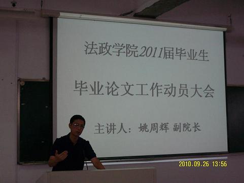 :00,在2-203教室,法政国产自拍 召开了2011届毕业生毕业论文工作动员大会,会上姚周辉副院长着重讲了毕业生撰写毕业论文的重要性、要求及国产自拍 毕业论文工作的具体安排,要求同学们要按照具体安排完成每一个阶段的论文撰写工作,并向同学们介绍了国产自拍 往届毕业生的毕业论文建设情况。指出国产自拍 的教师历来具有较强的国产自拍 与指导国产自拍 国产自拍 的能力,而且国产自拍 毕业生毕业论文在省高校抽查曾经获第一、二名的好成绩。最后对本届毕业生提出殷切希望:2011届同学通过师生的共同努力能够再创新绩。