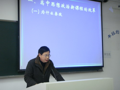 做了一场题为《普通高中思想政治新课程的课堂教学实践和改革》的讲座。讲座由思政专业建设负责人任映红教授主持。 林月周教授从事中学政治教育多年,有着丰富的教学经验,对高中政治新课程的课堂教学实践和改革研究颇多,有着自己的独到见解。他阐述了高中政治新教改的必要性,介绍了新教改后课程结构、管理、内容、价值取向、教学方式、教学目标、教学评价、教师角色的变革。林月周教授指出,高中思想政治新课强调"三个贴近"(即贴近实际、贴近现实、贴近国产自拍