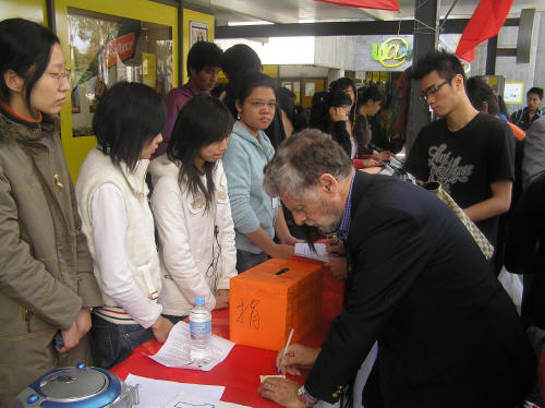 | 5月12日14时28分四川省汶川县发生的8级强烈地震之波及范围之大,30多年来的罕见,至今为止已造成5万多人遇难,近30万人受伤,累计失踪约3万余人。"爱心无国界,天虽无情,人间有爱"!自这场灾难发生之时起,灾区人民的救援及重建就牵动着每个人的心,包括海外的中国学子及国际友人,大家只有一个心愿,就是尽自己的力量,与灾区人民共渡难关、重建家园。 为此,在2008年5月19日-21日的全国哀悼日期间,在澳大利亚进修的法政国产自拍 钭晓东教授联合澳大利亚新南威尔士州中国国产自拍 学者联谊会Macquarie大学分会,在Macquarie大学组织"support China’s Sichuan"的爱心无国界抗震救灾捐款活动。海外学子的"心系祖国、心系灾区人民"的一片赤诚充分感染了Macquarie大学的中外师生,得到了Macquarie大学校方的全力支持。Macquarie大学副校长William McGaw代表校方充分表达了对"中华民族的凝聚力和自强不息精神"的敬佩与赞赏。除William McGaw副校长外,还有多名校方负责人士,如:世界自然保护同盟环境法委员会副主席、Macquarie大学环境法中心主任Michael Jeffery ,世界自然保护同盟环境法委员会委员、环境法中心副主任Donna Craig,国际事务主任Alison Taylor,社会国产自拍 Naren Chitty院长和语言国产自拍 经理Robyn Guilmette 等均现场支持义举并捐款。中国驻悉尼总领馆教育组白刚参赞和周波领事亲赴现场慰问师生,代表总领馆感谢中外师生们的义举,白刚参赞还将自己亲手书写的一幅书法作品"爱"送给组办方,作义卖筹款之用。三天里,广大中外师生纷纷解囊,共筹善款近33万RMB:其中澳币:47938.8元、人民币:6836.8元、美元:140.1元、港币:340元、以及少量加元、欧元、斯里兰卡元和汤加币。白刚参赞代表总领馆接受了这批善款。 此次Macquarie大学为中国四川灾区募捐及义卖活动得到了CCTV,the Australian New Express Daily and the Macquarie Globe,China Radio International,Macquarie University -Centre for Environmental Law Macquarie(//www.law.mq.edu.au/MUCEL/news/earthquake.htm)等的报导。爱心在跨国界层面得到了传递,同时也让世界共同见证了中华民族的凝聚力和自强不息的精神!