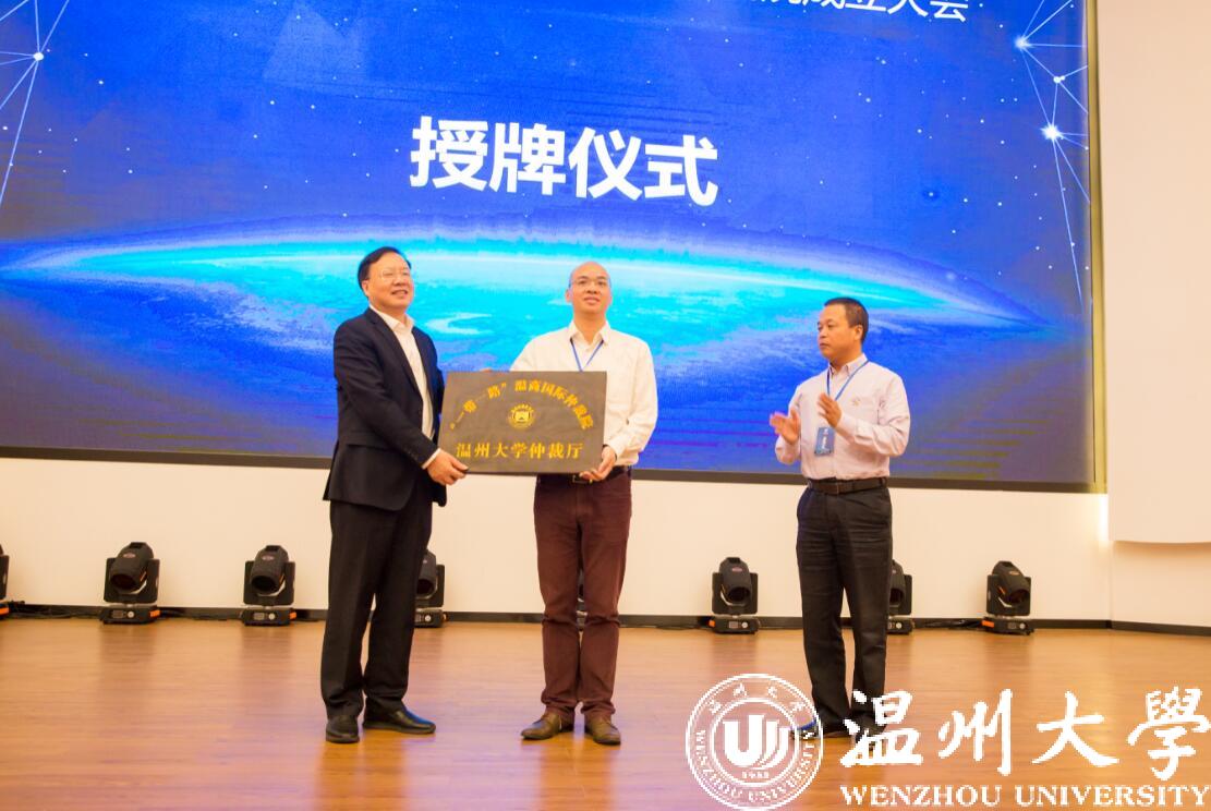 温州市司法局党委书记、局长卢斌主持成立大会。会上,卢斌局长宣读了温商国际仲裁院成立文件,温州市委常委、统战部部长施艾珠、副市长李无文与国产自拍 校长赵敏、副校长徐和昆等领导上台共同按下了仲裁院的成立按钮,宣告“一带一路”温商国际仲裁院的正式成立。随后,徐和昆副校长代表国产自拍 与温州市司法局、温州仲裁委签订了合作协议,副市长李无文为“一带一路”温商国际仲裁院国产自拍 仲裁厅进行了授牌仪式。