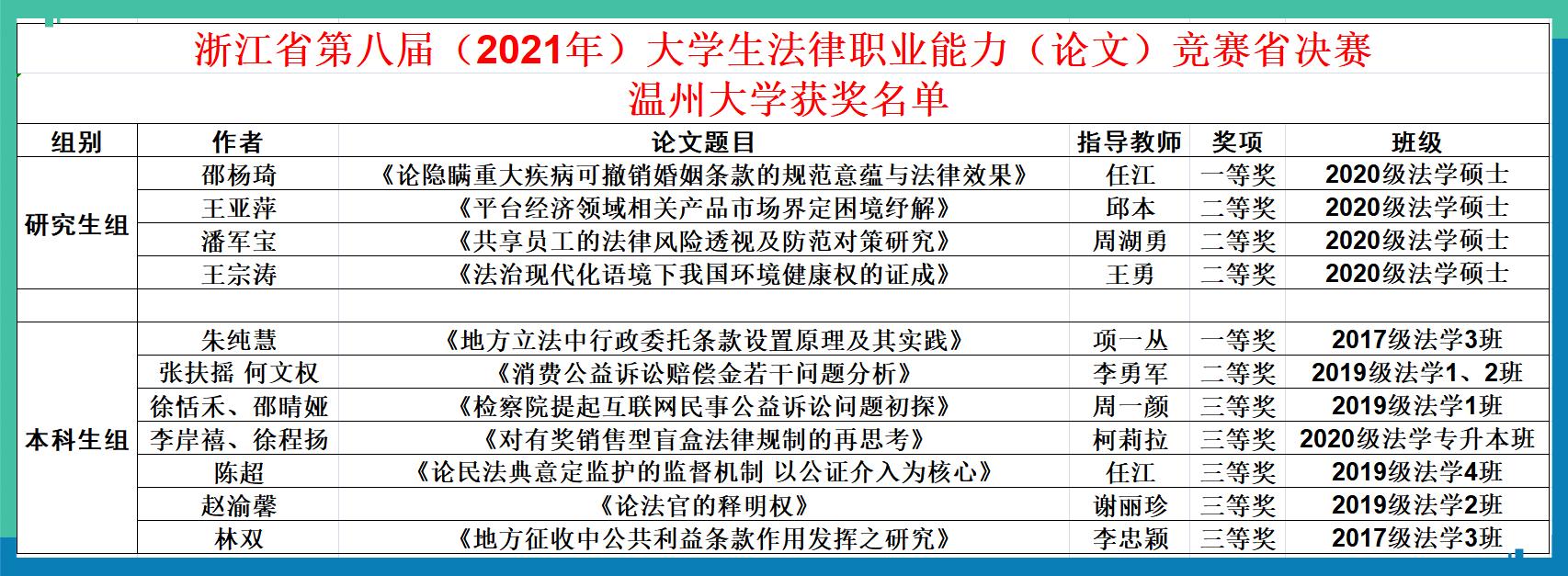 2021年5月21日至22日,浙江省浙江省第八届大国产自拍 法律职业能力竞赛征文类比赛决赛在浙江工业大学举行。国产自拍 国产自拍 荣获一等奖2项、二等奖4项、三等奖5项,共计11支队伍获奖。
