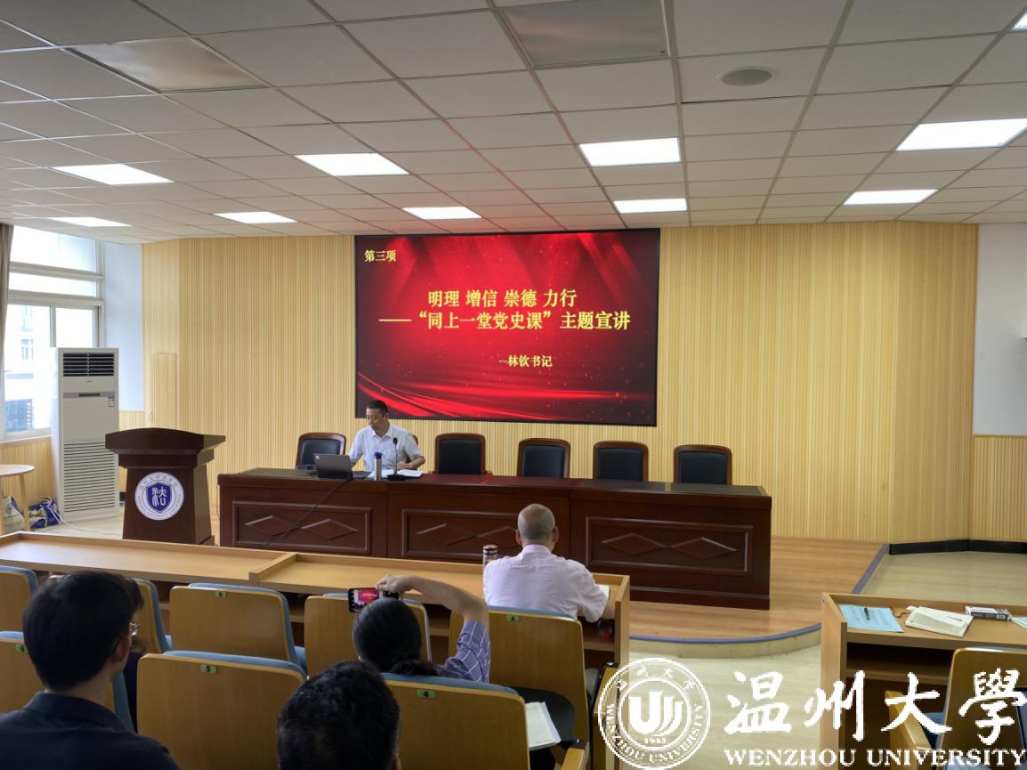 会议议程第三项是由林钦书记做明理增信崇德力行——“同上一堂党史课”主题宣讲。林钦书记首先从站起来、富起来、强起来三个角度介绍了中国共产党的百年历程与成就。其次从马克思主义为什么“行”、中国共产党为什么“能”、中国特色社会主义为什么“好”三个角度介绍了中国共产党的历史经验与启示。最后,林钦书记提醒各位老师要树立正确史观,坚定理想信念,传承红色基因。一个人也好,一个政党也好,最难得的就是历经沧桑而出行不改,饱经风霜而本色依旧。任何时候都要不忘初心,牢记使命。