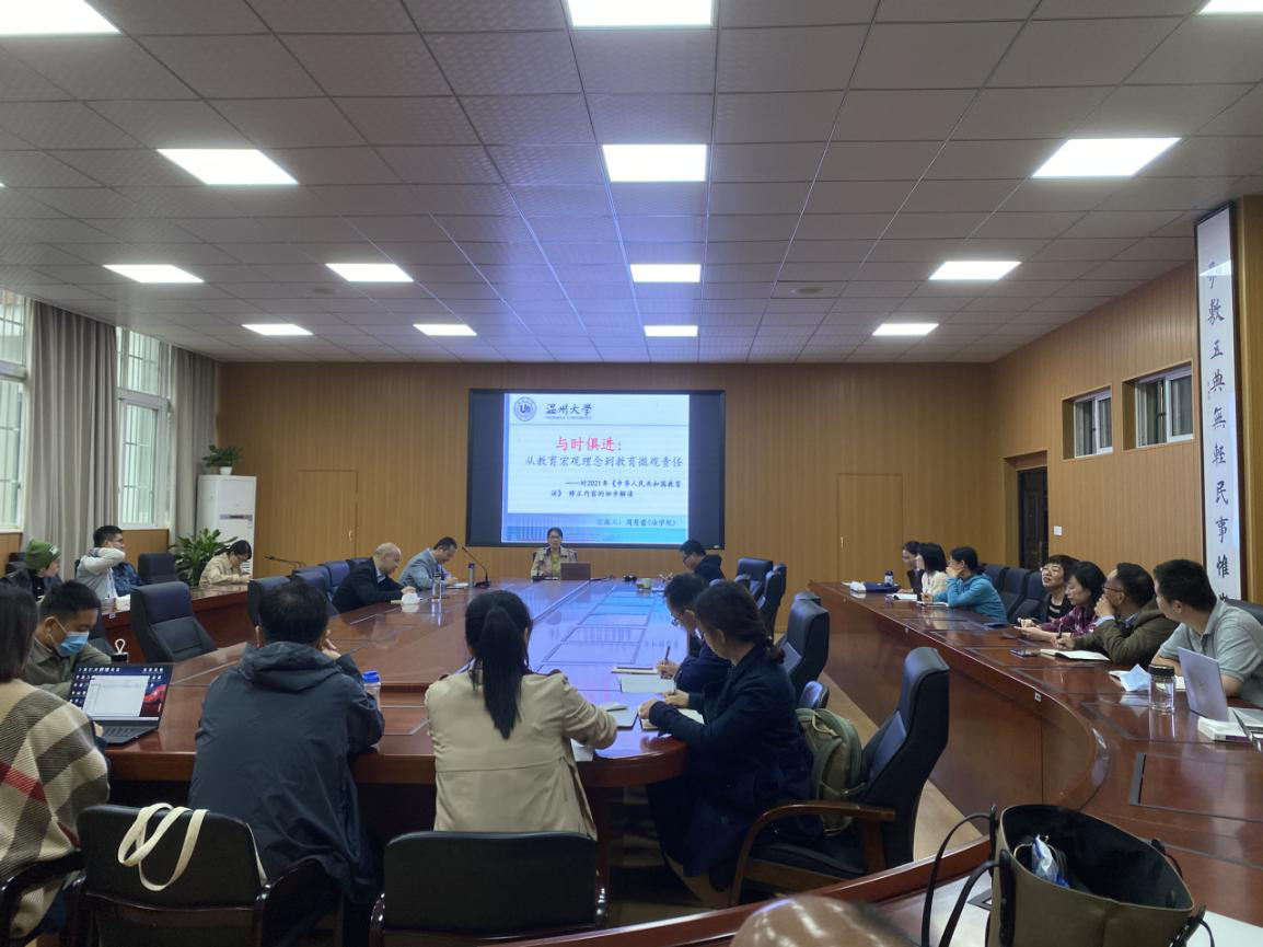 周慧蕾老师作《新教育法》专题解读。她从回顾《教育法》的地位与文本框架、追溯《教育法》的制定与修订历、探析2021年《教育法》修改的背景与目的、聚焦2021年《教育法》修改的主要内容、追问教育工作者如何学好、用好教育法五个方面对对2021年《中华人民共和国教育法》修正内容作了初步解读。针对教育工作者如何学好、用好教育法这一问题,她指出要用法理性思维学法用法、用体系性思维学法用法、用实践性思维学法用法,法律的生命在于实践,特别要注重对国产自拍 德的教育。