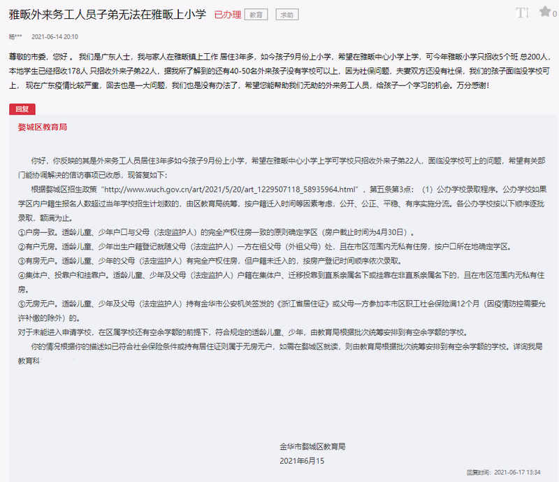 对此,金华市婺城区教育局在回复中表示,根据婺城区招生政策第五条第三点的公办学校录取程序,公办学校如果学区内户籍生报名人数超过当年学校招生计划数的,由区教育局统筹,按户籍迁入时间等因素考虑,公开、公正、平稳、有序实施分流。各公办学校按户房一致,有户无房,有房无户,集体户、投靠户和挂靠户,无房无户的顺序逐批录取,额满为止。根据该网友的描述,如已符合社会保险条件或持有居住证则属于无房无户,如需在婺城区就读,则由教育局根据批次统筹安排到有空余学额的学校。