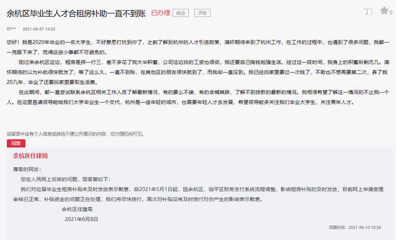 对此,杭州市余杭区住建局作出回复:自2021年5月1日起,因余杭区、临平区财务支付系统流程调整,影响租房补贴的及时发放,目前网上申请受理审核已正常,补贴资金的问题正在处理,租房补贴将尽快拨付。