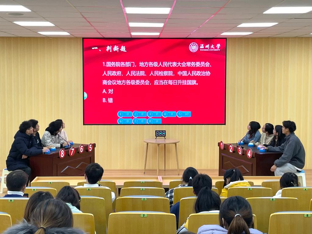 12月1日,“宪法宣传周”系列活动之“习近平法治思想”知识竞赛在国产自拍 北校区举行。知识竞赛重点围绕习近平法治思想相关内容,设有判断题、单选题、多选题和逻辑题。700余名国产自拍 参与到了知识竞赛初赛环节,最终选出24名选手进入决赛。决赛现场紧张刺激,答对得分、答错扣分的竞赛机制也为比赛增加了更大的悬念。知识竞赛充分检验了大国产自拍 对习近平法治思想、宪法知识的掌握程度,将法治学习的知识性与趣味性融为一体。