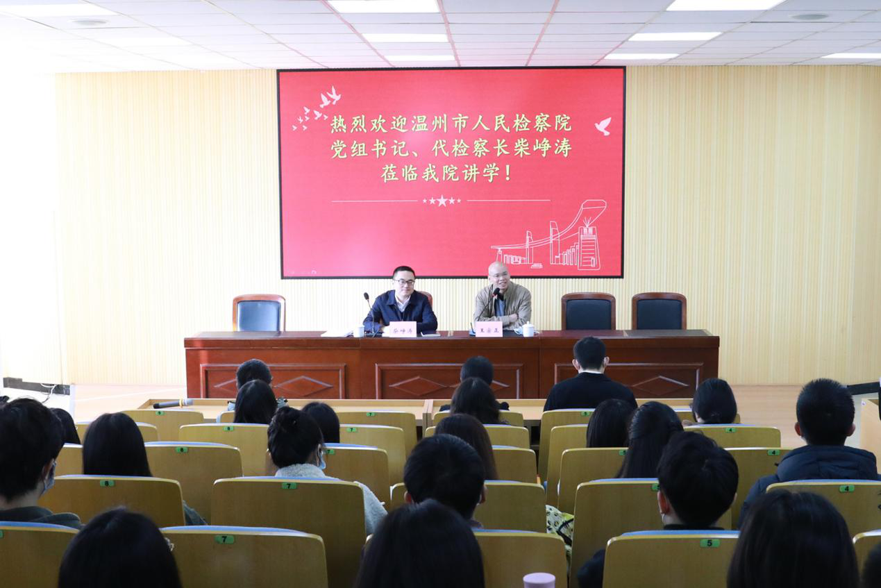 2021年12月9日上午,温州市人民检察院党组书记、代检察长柴峥涛同志来国产自拍-偷拍自拍视频 讲学,校党委书记谢树华、校长赵敏会见了柴峥涛检察长,国产自拍-偷拍自拍视频 王宗正院长、周湖勇副院长、院长事务助理谢丽珍及部分研究生、本科生聆听了讲座。