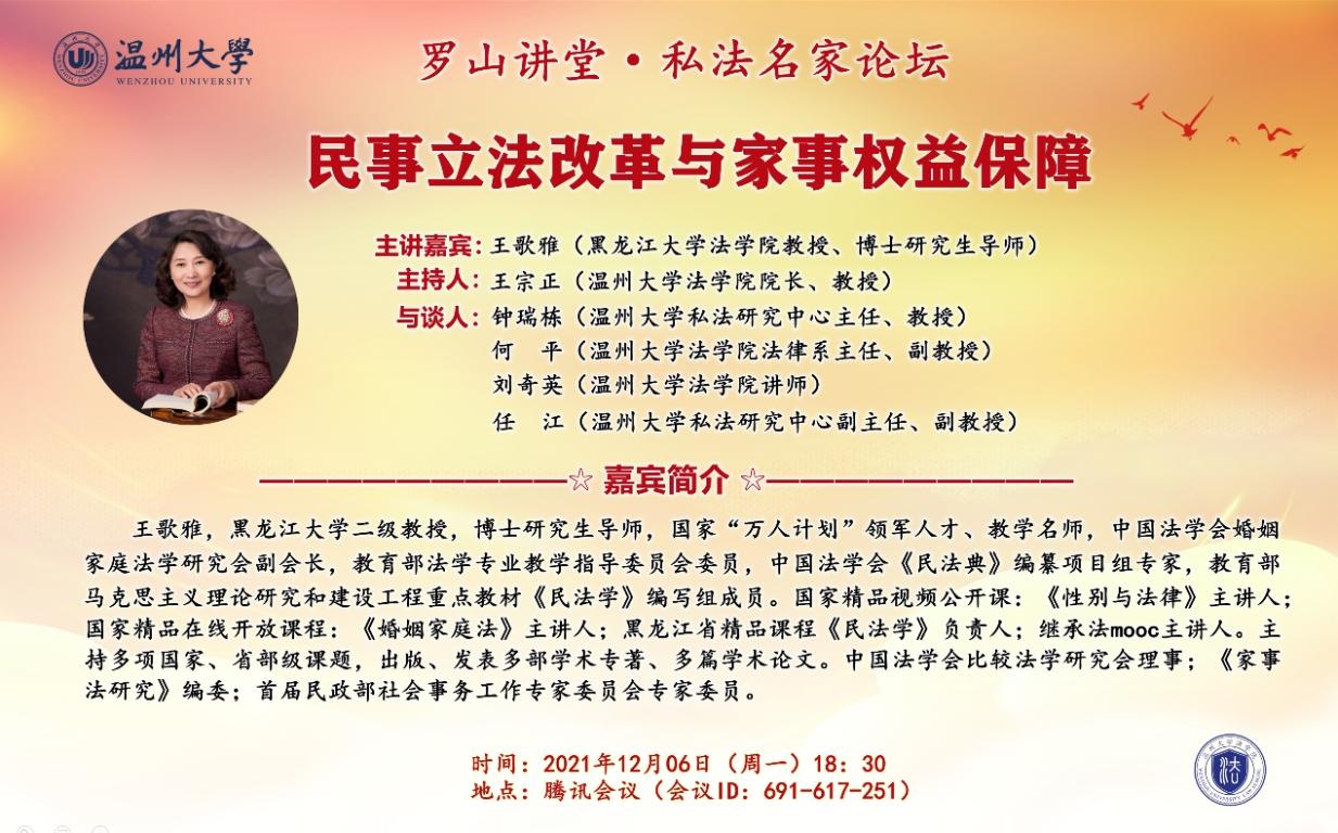 12月6日晚上六点半,黑龙江大学二级教授、博士研究生导师、国家“万人计划”领军人才、教学名师,中国法学会婚姻家庭法学研究会副会长、教育部法学专业教学指导委员会委员、中国法学会《民法典》编纂项目组专家王歌雅教授做客“罗山讲堂·私法名家论坛”,以“民事立法改革与家事权益保障”为主题,通过腾讯会议云在线的方式,为温大国产自拍-偷拍自拍视频 师生展开了一场精彩的国产自拍 讲座。讲座由国产自拍-偷拍自拍视频 院长王宗正教授主持,国产自拍-偷拍自拍视频 钟瑞栋教授、何平副教授、刘奇英讲师以及任江副教授与谈,任江副教授与国产自拍-偷拍自拍视频 21级硕士研究生集体在301会议室共同学习了讲座的内容,线上线下参与师生近200人。王歌雅教授围绕社会观念变化、民事立法改革、权益保障路径三个部分,阐述在后民法典时代,民事立法的变与不变。