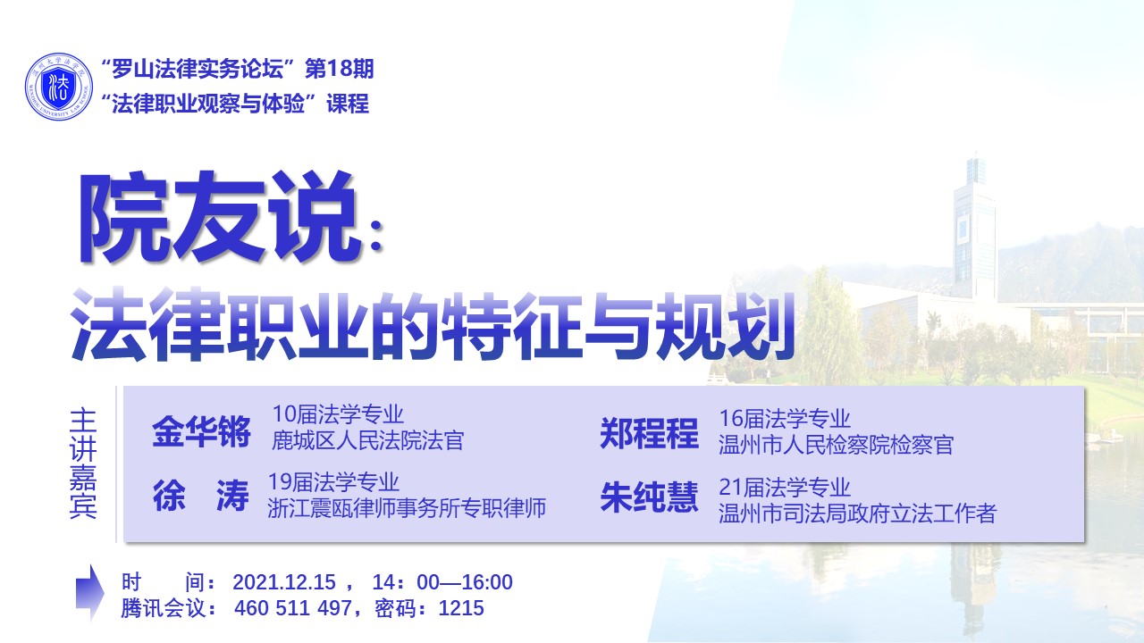 021年12月15日下午2点,国产自拍-偷拍自拍视频 优秀院友金华锵(10届法学专业,鹿城区人民法院法官)、郑程程(16届法学专业,温州市人民检察院检察官)、徐涛(19届法学专业,浙江震瓯律师事务所专职律师)、朱纯慧(21届法学专业,温州市司法局政府立法工作者)作客第18期罗山法律实务论坛,为国产自拍 大三学子开展题为《院友说:法律职业的特征与规划》的法律职业观察与体验课程。根据疫情防控的要求,本次讲座采取线上形式进行。讲座由国产自拍-偷拍自拍视频 项一丛老师主持,八名国产自拍 代表与谈,吸引了不少非选课的同学参加,共近200人参加了本次课程讲座。