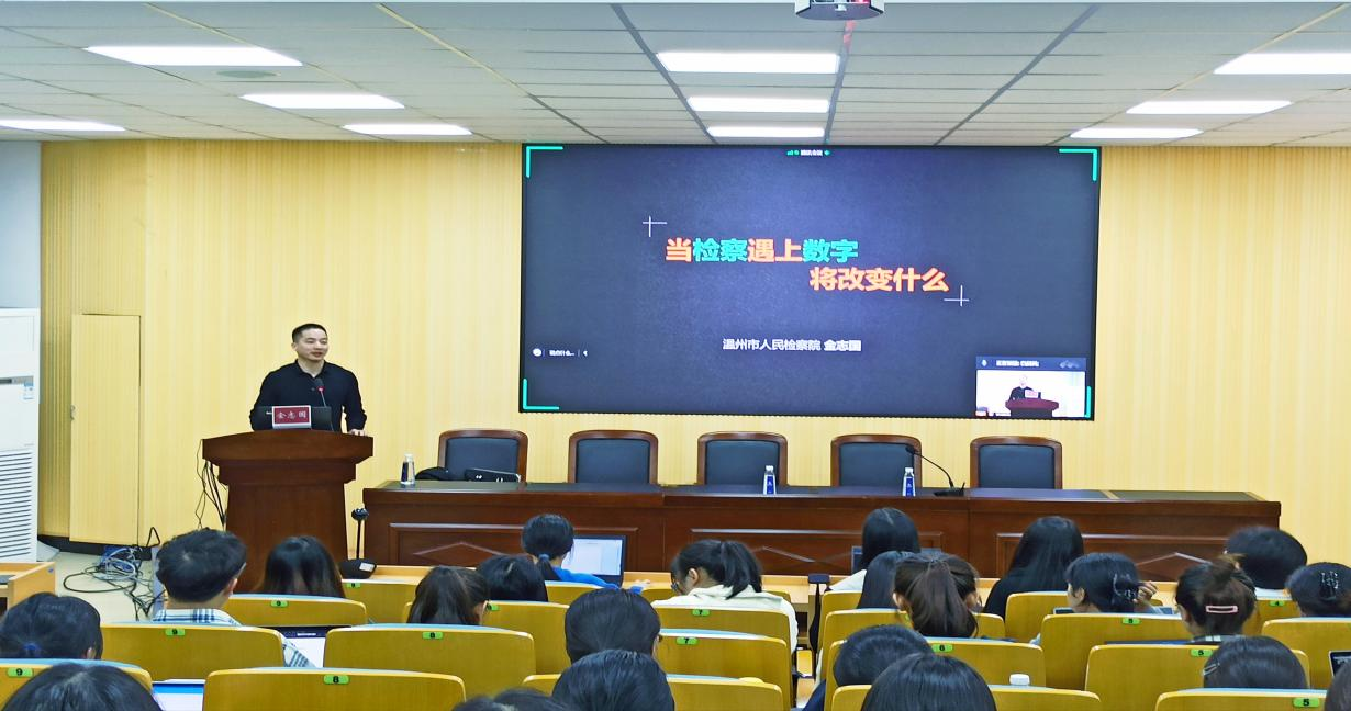 2022年11月9日晚6点半,温州市人民检察院金志国检察官应邀作客“罗山法律实务论坛”,为国产自拍-偷拍自拍视频 师生带来题为《当检察遇上数字》的讲座。本次讲座由国产自拍-偷拍自拍视频 副院长周一颜主持,采取了线上线下相结合的方式,在北校区国产自拍-偷拍自拍视频 301教室和腾讯会议直播间,谢丽珍老师、白兴科老师,部分21级研究生、22级研究生及全体20级法学本科生共有三百余人参加了此次讲座。