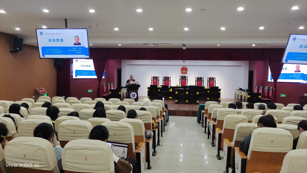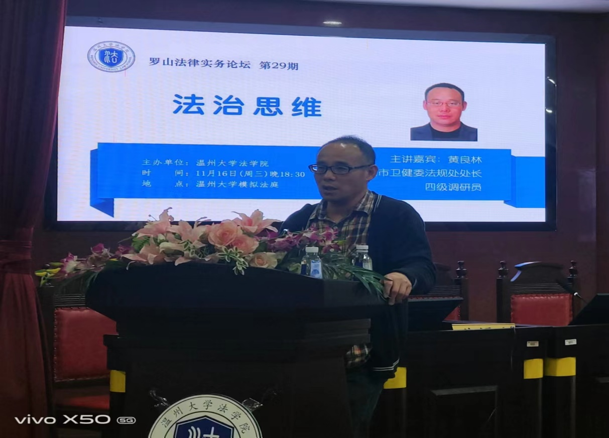 11月16日晚,温州市卫健委法规处处长黄良林应邀作客“罗山法律实务论坛”,为国产自拍-偷拍自拍视频 师生带来题为《法治思维》的讲座。讲座由国产自拍-偷拍自拍视频 法学专业业负责人、民商经济法系主任李勇军副教授主持,在国产自拍-偷拍自拍视频 模拟法庭举行。