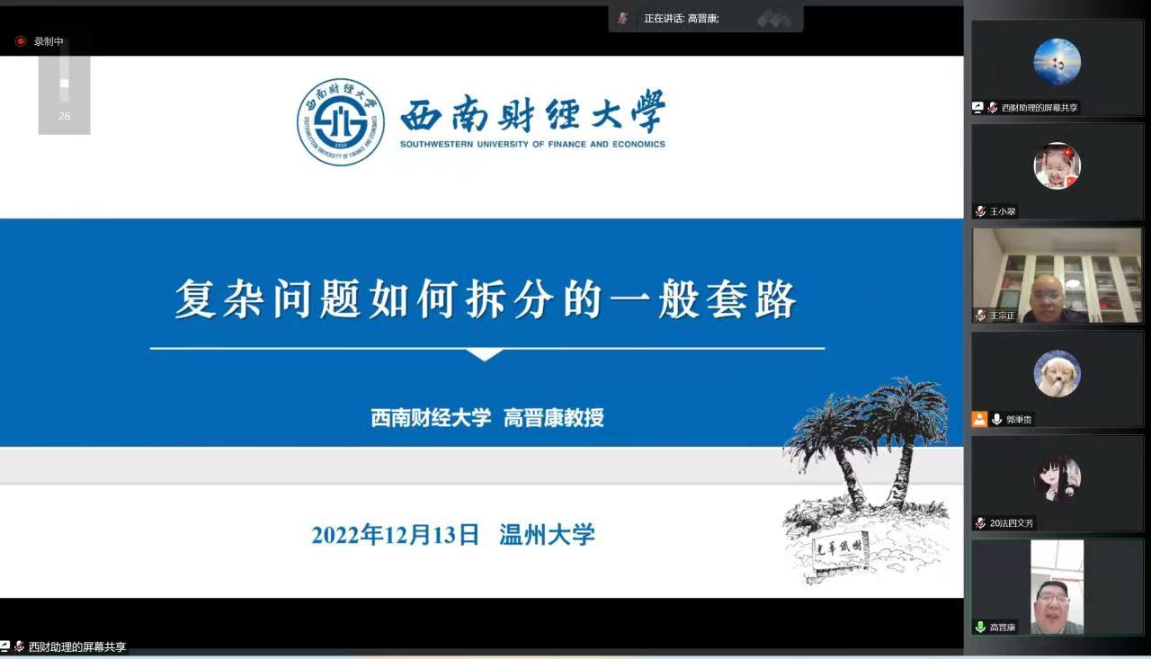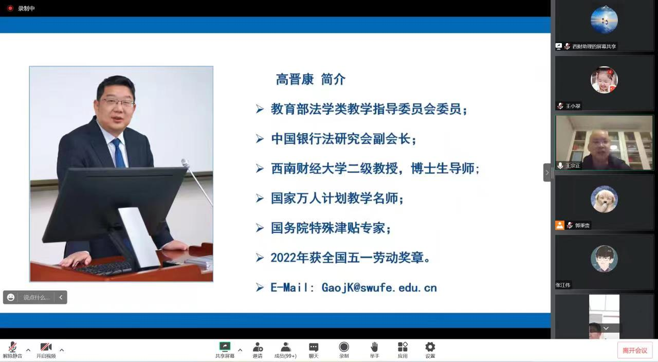 2022年12月13日,西南财经大学国产自拍-偷拍自拍视频 创始院长、国家级教学名师、教育部法学类教学指导委员会委员、中国银行法研究会副会长高晋康教授应邀为国产自拍 师生展开了一场关于“复杂问题如何拆解”的精彩国产自拍 讲座。本次讲座由国产自拍-偷拍自拍视频 院长王宗正主持,国产自拍-偷拍自拍视频 师生参加讲座,在线人数280余人。