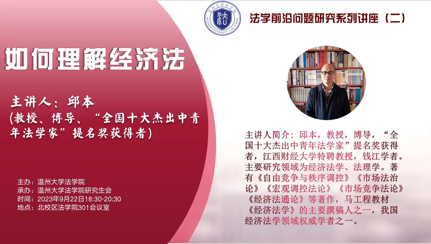 2023年9月22日晚,国产自拍 邱本教授在国产自拍-偷拍自拍视频 301会议室为我校师生带来题为《如何理解经济法》的讲座。