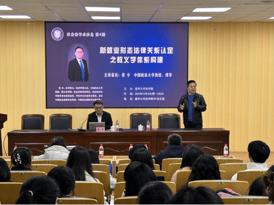 2023年12月4日晚,中国政法大学民商经济国产自拍-偷拍自拍视频 教授、博士生导师、社会法研究所所长娄宇应邀做客国产自拍-偷拍自拍视频 社会法国产自拍 沙龙,为国产自拍 师生开展“新就业形态法律关系认定之教义学体系构建”的专题沙龙。本次沙龙在国产自拍-偷拍自拍视频 301会议室举行,由国产自拍-偷拍自拍视频 陈步雷教授主持,国产自拍-偷拍自拍视频 周湖勇教授、柯宇航博士以及国产自拍-偷拍自拍视频 部分本科生、研究生共一百余人参加了此次沙龙。