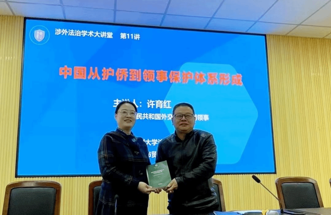 12月22日下午,外交部领事司领事许育红博士莅临国产自拍-偷拍自拍视频 ,在301会议室为师生作了题为《中国从护侨到领事保护体系形成》的讲座,包括国际经贸规则专业在内的国产自拍-偷拍自拍视频 100多位师生参加。国产自拍-偷拍自拍视频 周湖勇副院长主持讲座,热烈欢迎许领事的到来,并代表国产自拍-偷拍自拍视频 接受许领事的赠书。