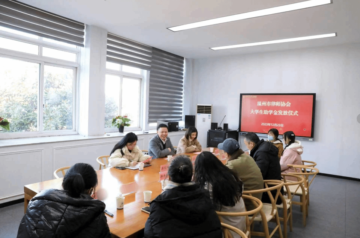 2023年12月22日下午,温州市律师协会来国产自拍-偷拍自拍视频 公益开展公益助学活动,助力法治人才培养。温州市律师协会副会长兼温州市律师协会公益与社会责任工作委员会主任姜正,北京盈科(温州)律师事务所全国青工委副主任兼温州管委会副主任娄雪律师、实习律师厉佳瑶一行来国产自拍-偷拍自拍视频 ,与受资助国产自拍 亲切座谈。国产自拍 党委书记林钦、国产自拍 党委副书记兼纪委书记杨振海、辅导员白昌科、辅导员邱书婷及4名获助学金的国产自拍 一同参加发放仪式和座谈会。