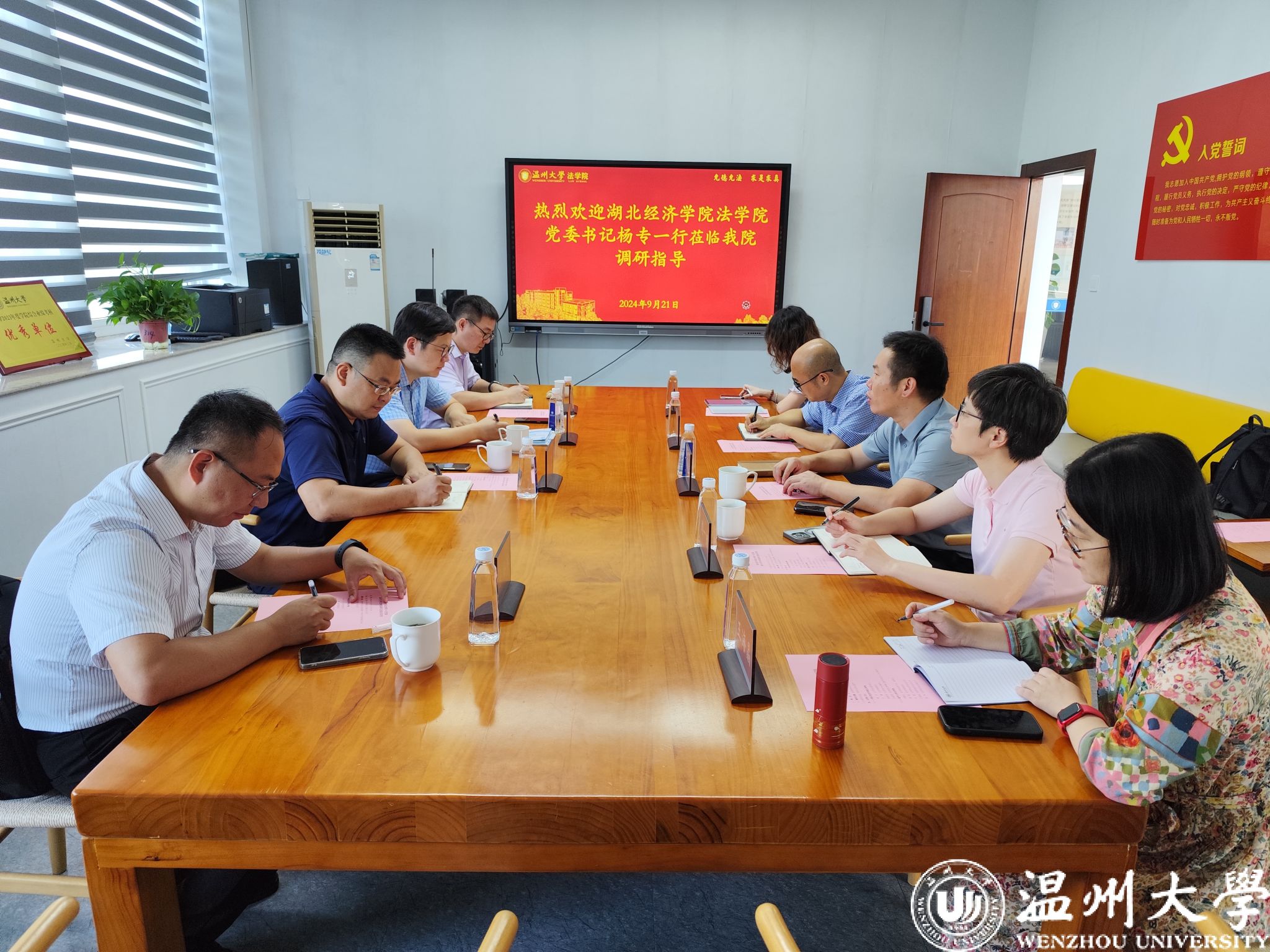 9月21日上午,湖北经济国产自拍 国产自拍-偷拍自拍视频 党委书记杨专、副院长王腾一行四人莅临国产自拍-偷拍自拍视频 调研座谈。国产自拍-偷拍自拍视频 党委书记周敬业、副院长周一颜、法学专业负责人肖磊、经济法系主任王海晶、诉讼法系副主任张伟出席座谈会。周敬业主持座谈。