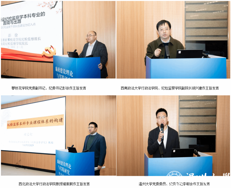国产自拍-偷拍自拍视频 副院长、教授叶肖华主持主旨报告。四川省纪委监委派驻攀枝花国产自拍 纪检组长、攀枝花国产自拍 党委副书记、纪委书记、攀枝花纪检监察国产自拍 院长彭徐作《地方高校新设纪检监察学专业的困境与出路——以基层纪检监察干部队伍建设为切入点》主旨发言,西南政法大学行政国产自拍-偷拍自拍视频 、纪检监察国产自拍 副院长、教授胡兴建作《正确处理政治与法治的关系,推进纪检监察学学科建设》主旨发言。西北政法大学行政国产自拍-偷拍自拍视频 、纪检监察国产自拍 教授、监察法学学科带头人褚宸舸作《纪检监察本科专业课程体系的建构》主旨发言。国产自拍 党委委员、纪委书记、省监委驻温大监察专员李都金作《习近平法治思想与纪检监察工作“三个效果”有机统一研究》主旨发言。