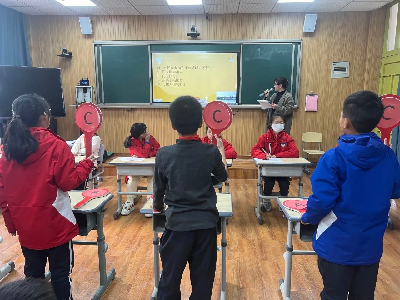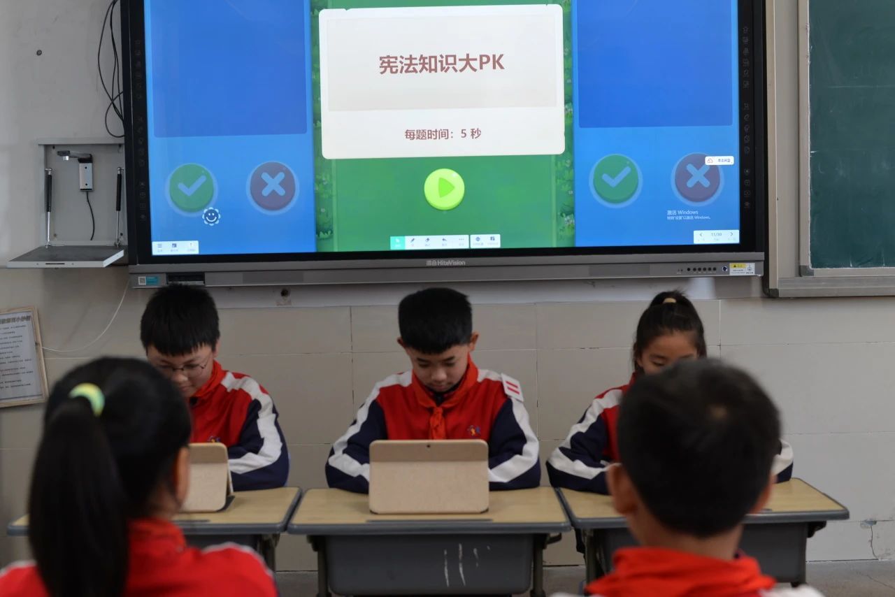在班队课上,湖州市织里镇晟舍小学组织国产自拍 进行“学宪法、讲宪法”知识竞赛大PK,寓教于乐,进一步弘扬宪法精神,让宪法的种子在孩子们心中生根发芽。