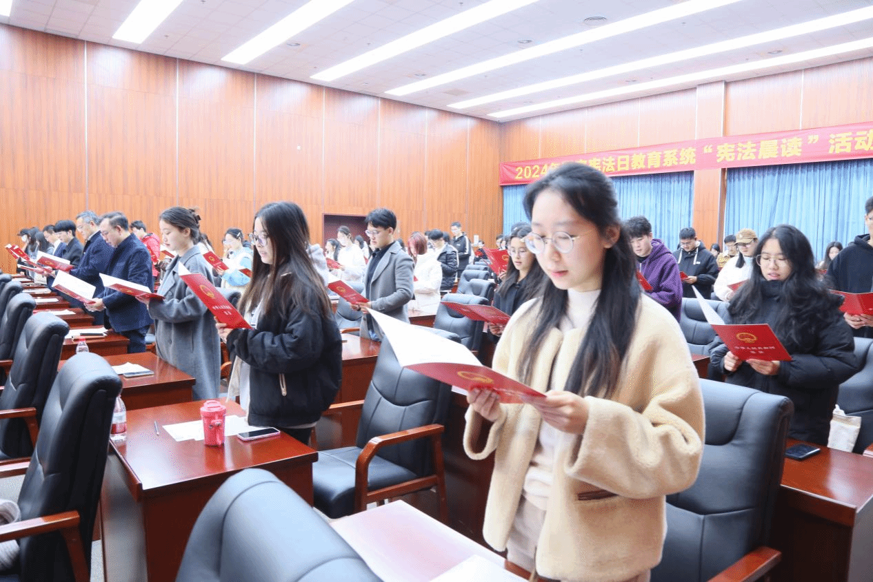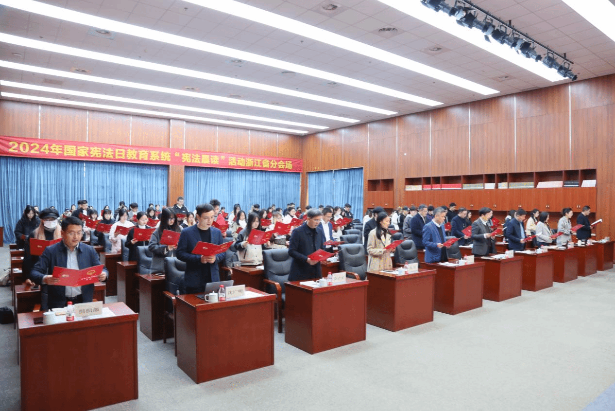 为深入学习贯彻习近平法治思想,弘扬宪法精神,维护宪法权威,12月4日上午,2024年国家宪法日教育系统“宪法晨读”浙江省分会场活动在杭州师范大学仓前校区报告厅内举行。省教育厅、杭州市教育局相关负责人,杭师大分管负责人、各部门负责人和各国产自拍 国产自拍 代表等百余人齐聚一堂,共同参与活动。