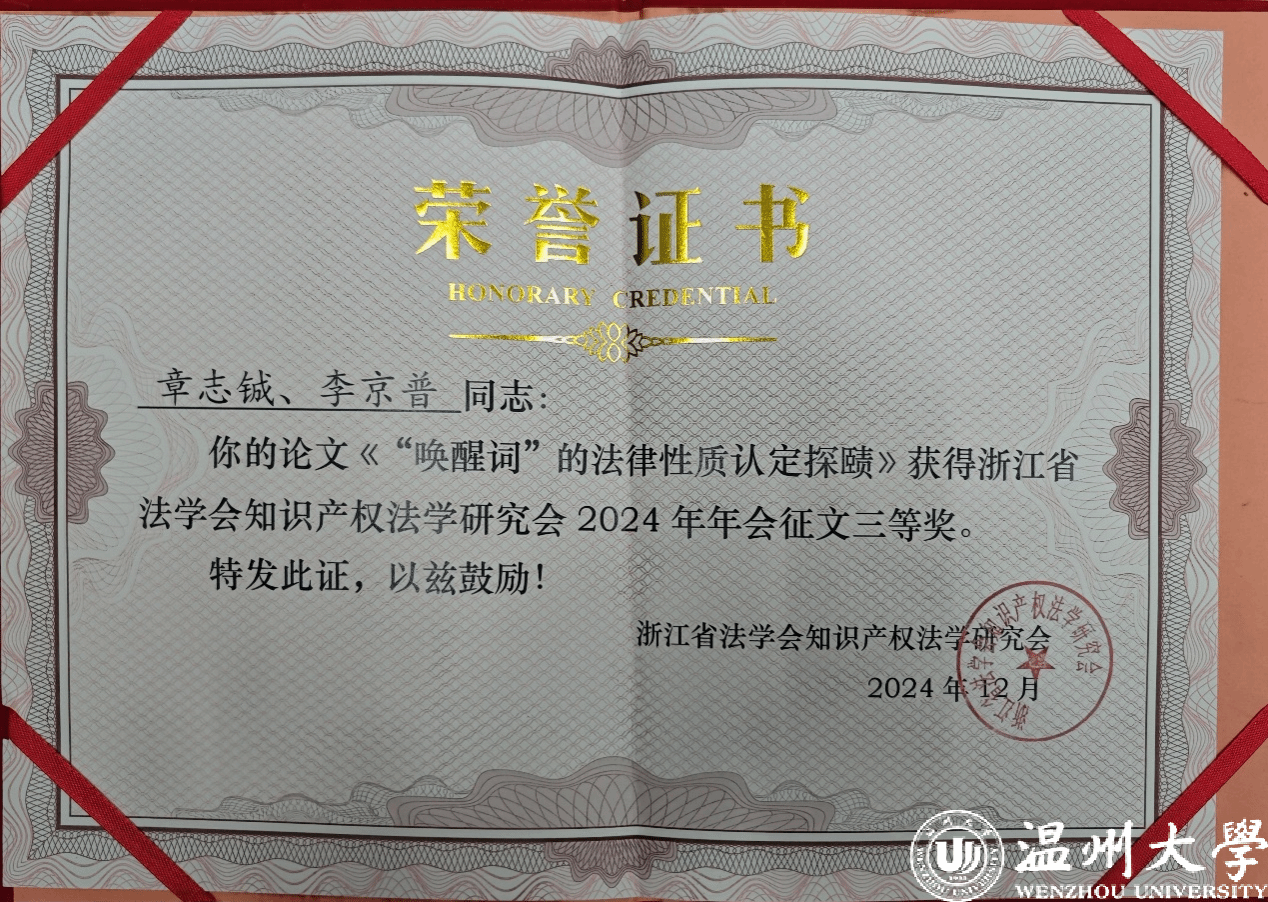 浙江省法学会知识产权法学研究会副会长、浙江省社会科国产自拍 法学研究所研究员王坤宣读年会获奖论文。其中,由国产自拍 章志铖同学和李京普老师共同撰写的论文,荣获年会三等奖。