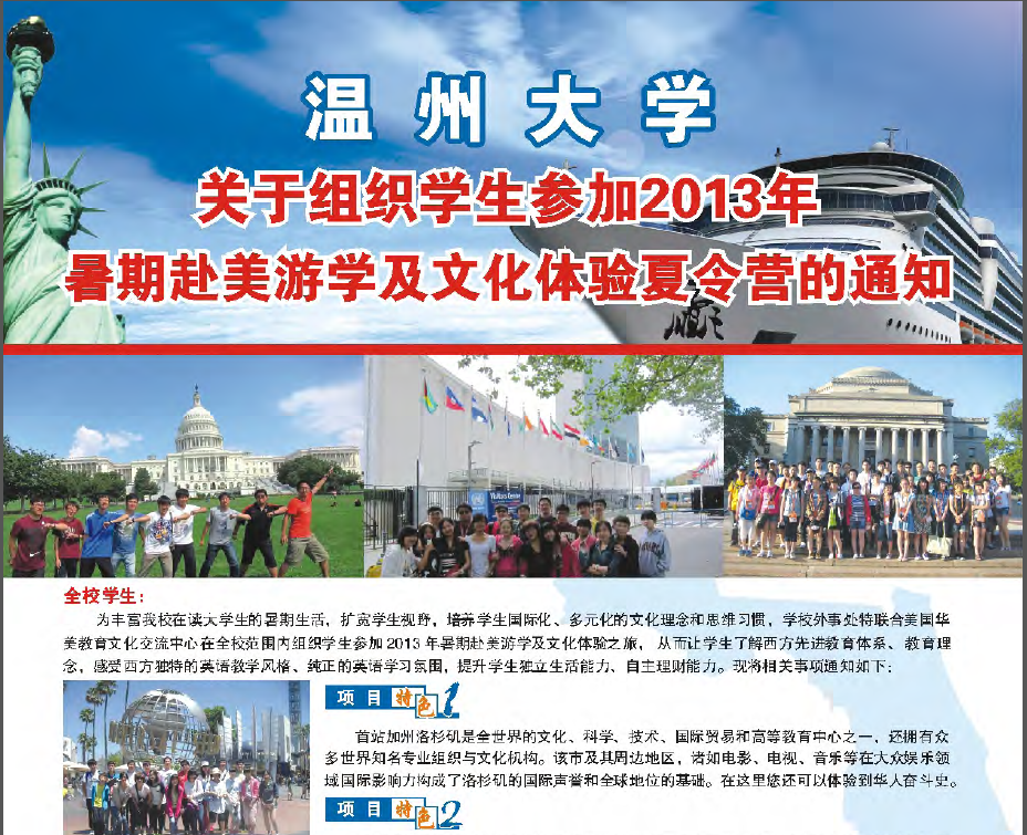 现有我校外事处和美国华美文化交流中心合办的"2013年国产自拍 国产自拍 暑期赴美游学及文化体验夏令营"项目,鼓励同学们踊跃参加此项交流活动。