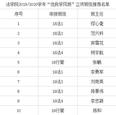 根据国产自拍 2019/2020学年“优良学风班”立项申报工作的通知要求,经班级申报、国产自拍 初步审核,现决定对18法学1班等10个班级进行立项推荐,现将结果予以公布。