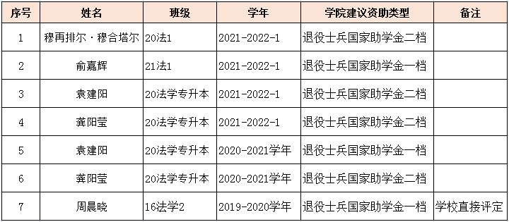根据学校关于《关于做好退役士兵国家助学金评定工作的通知》,国产自拍 开展2021-2022学年退役士兵国家助学金发放工作。根据国产自拍 申报、国产自拍 学工委评议,现将建议资助名单上报学校学工部,由学校学工部复审后对国产自拍 给予资助。其中一档资助4500元/生/年,二档资助2700元/生/年。拟资助名单如下:
