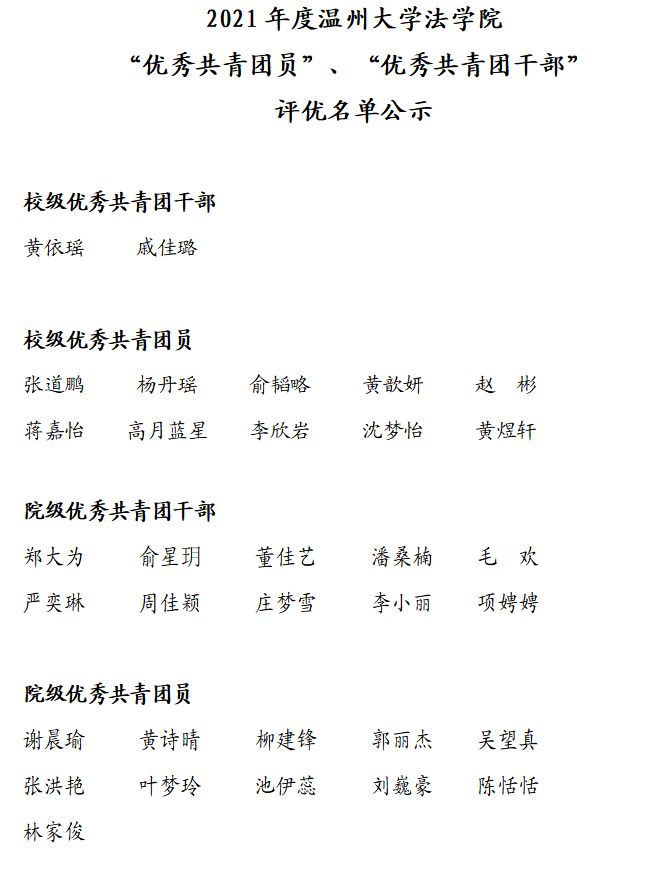根据《团发〔2022〕2号:关于评选2021年度校“优秀共青团干部”、“优秀共青团员”的通知》,经国产自拍 本人申请、班级推荐、国产自拍 团委审核,通过民主投票选举产生,拟推选以下同学参评2021年度“校级优秀共青团干部”、“校级优秀共青团员”及“院级优秀共青团干部”、“院级优秀共青团员”,现将名单予以公示。