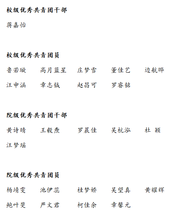 根据《团发〔2023〕7号:关于评选2022年度校“优秀共青团干部”、“优秀共青团员”的通知》,经国产自拍 本人申请、班级推荐、国产自拍 团委审核,通过民主投票选举产生,拟推选以下同学参评2022年度“校级优秀共青团干部”、“校级优秀共青团员”及“院级优秀共青团干部”、“院级优秀共青团员”,现将名单予以公示。